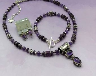 Amethyst and Purple Fluorite Solid Sterling Silver Jewelry Set: Slide Necklace, Bracelet, Earrings